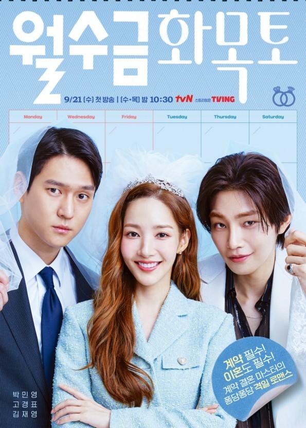 월수금화목토는 현대적 관계와 색다른 사랑이라는 주제를 창의적으로 다루는 2022년 한국 로맨틱 코미디입니다. 박민영, 고경표, 김재영 주연의 이 드라마는 유머와 로맨스, 애틋한 순간이 어우러진 tvN에서 방송된 16부작 드라마다. 이 드라마는 신선한 전제, 매혹적인 공연, 직업과 개인의 경계에 대한 탐구로 돋보입니다. 독특한 서사와 카리스마 넘치는 전개로 국내외 관객들에게 성공적으로 어필했다. 이야기는 사회적 외모를 위해 파트너가 필요한 고객에게 동반자 서비스를 제공하는 전문 '계약 아내' 최상은(박민영)을 중심으로 진행됩니다. 상은은 능숙하고 우아하며 감정에서 벗어난 것처럼 보이며 고객이 사회적 기대를 헤쳐 나갈 수 있도록 결혼 생활의 행복에 대한 완벽한 외관을 제공합니다. 그녀의 일상은 매우 다른 두 남자가 그녀의 삶에 들어오면서 중단됩니다. 5년 동안 주 3일 '결혼'을 해 온 미스터리하고 내성적인 의뢰인 정지호(고경표)는 그녀에게 예상치 못한 감정을 불러일으키기 시작한다. 동시에, 유명 배우이자 새로운 고객인 강해진(김재영)은 치밀하게 짜인 그녀의 삶에 혼란과 로맨스를 불어넣는다. 상은은 지호에 대한 커져가는 감정과 유해진과의 짜릿한 케미스트리를 저울질하면서 직업적 의무와 개인적인 감정 사이의 균형을 맞추는 딜레마에 직면하게 된다. 이야기는 직업적 관계의 경계가 무너지는 과정과 상은이 자신의 마음을 여는 법을 배우면서 자기 발견을 향한 여정을 탐구합니다.